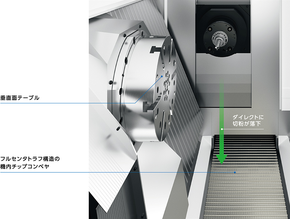 テーブルを垂直に配置したことで、加工点直下の機内チップコンベヤ上に