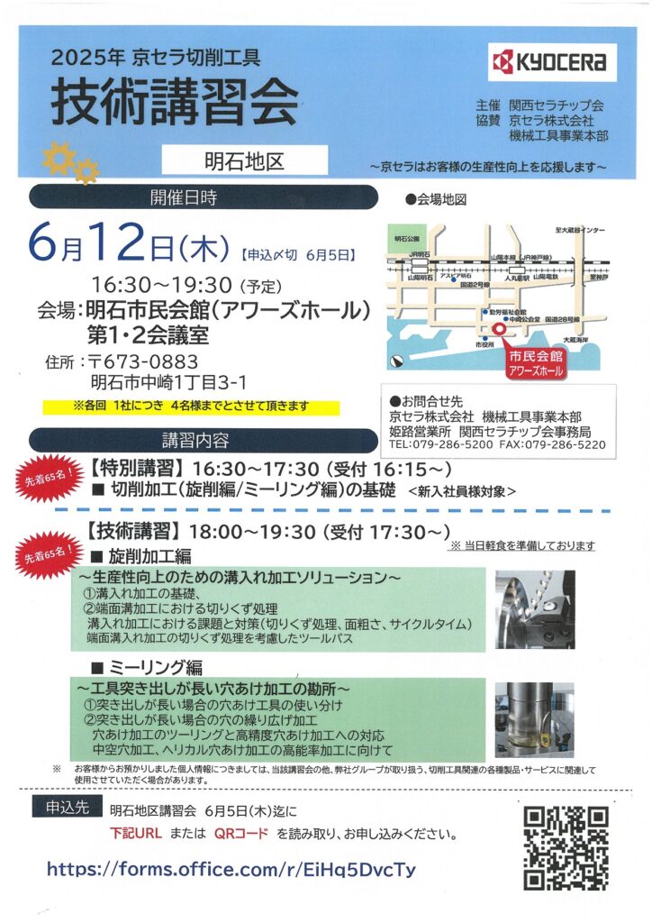 2025年6月12日(木)16:30~19:30 明石市民会館アワーズホールにて 京セラ切削工具技術講習会が開催されます