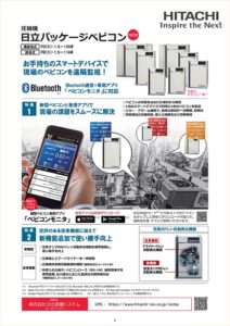圧縮機 日立パッケージベビコンのご紹介です! 特徴1.新型ベビコンと専用アプリで、ベビコンの状態をはなれた場所から確認が可能。 1台のスマートデバイスで同時に4台のベビコンを監視。 エラー・アラーム機能で、故障の原因が一目瞭然で、測解決できます。 消耗部品の交換時期、購入元連絡先などの情報確認も可能です。 特徴2.定評のある従来機能に加えて、新機能として空気タンク内のドレン自動排出機能を 標準装備し、使い勝手を向上。![]()