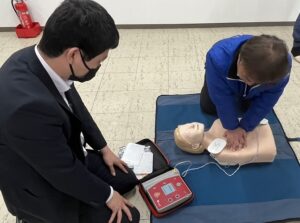 所員全員で実際に消火器を使用したり、救命救急訓練をしました。