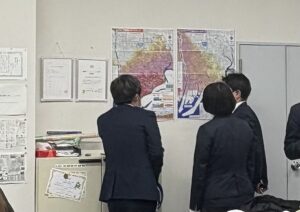 営業所周辺のハザードマップをみながら営業範囲の災害リスクについて話し合いました!