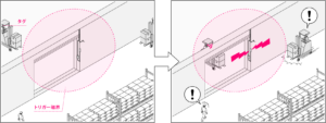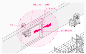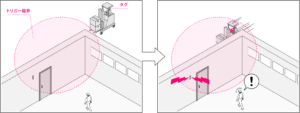 その磁界の範囲内に、ICタグを搭載したフォークリフトが入ると警報が作動する仕組みです。