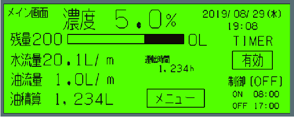 流量計で濃度を算出し、液晶パネルで確認可能。