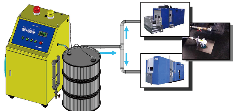 自動作製された切削液は配管を通じて工作機械へ自動供給。