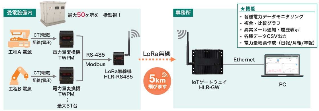 ・長距離通信が可能(5km)。配線工事は不要です。