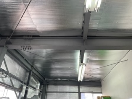| 工事内容 | 工場内2階の折半屋根の内側から遮熱シート「サーモバリア」を施工する事により、太陽からの輻射熱を約97%カットします。 |