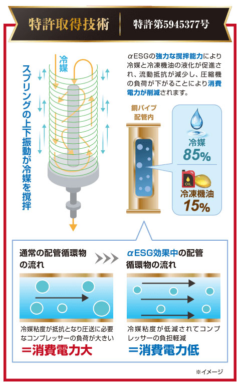 冷媒配管内に組み込むことで、圧縮機の効率を上げて電力使用量を削減します![]()