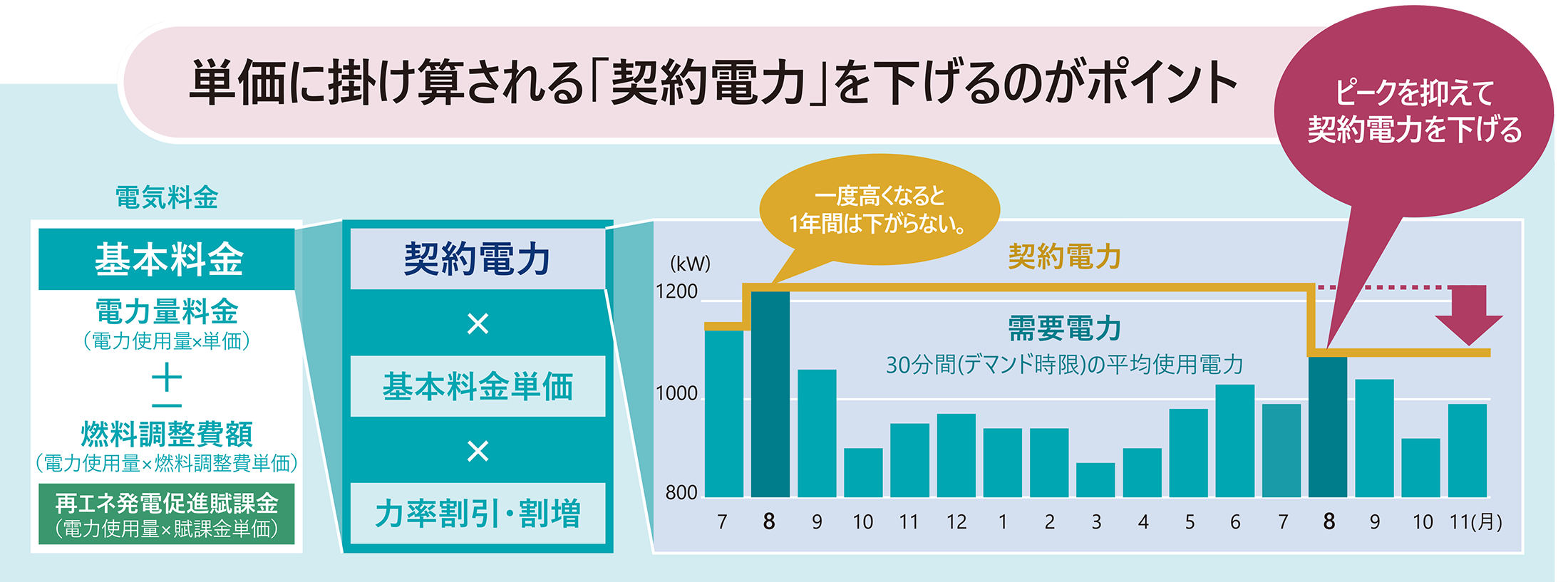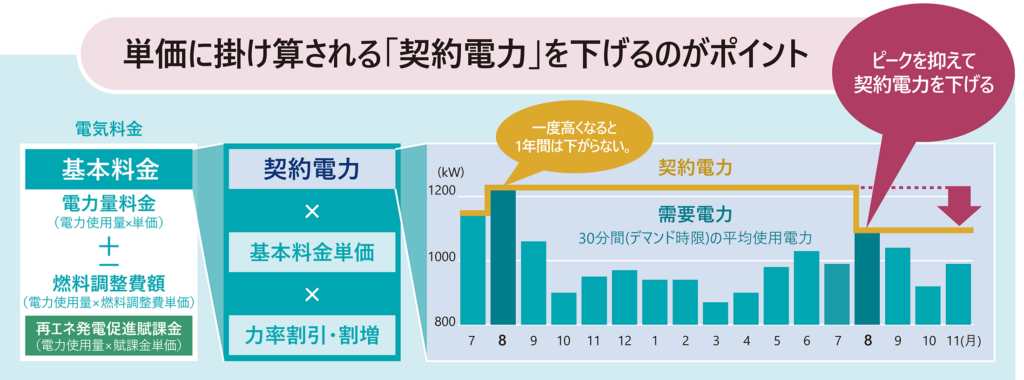 「契約電力」は直近1年間の最大デマンド値(最大需要電力)が適用されます。