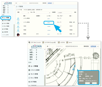 所在を確認したいユーザのIDをクリックすると、該当ユーザの