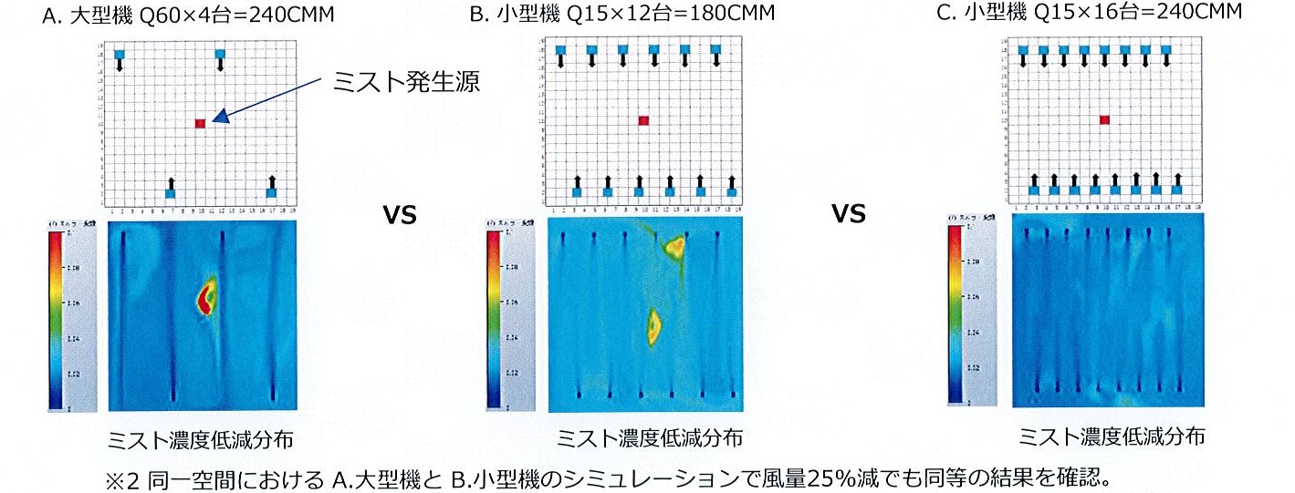 (2)小型集塵装置を分散設置することにより、空気攪拌能力が向上し、気流の淀みを改善することにより高い空気清浄度が期待できます。