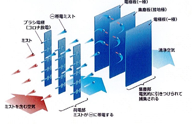 ミストを含む空気がコロナ放電している荷電極を通過すると、空気中のミストが一電位に帯電します。この帯電したミストが後段の集塵部に流入すると電気的な吸引力(クーロン力)を受けて集塵板(接地極)側に吸着捕集されます。