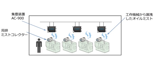 工作機械に搭載されているミストコレクターでは捕集切れないオイルミストを回収し、