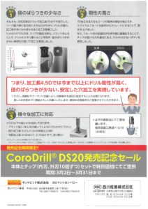 サンドビック コロドリルDS20におきまして 2020年3月2日から3月31日までの期間で発売記念セールが実施されます。 径のばらつきの少なさや剛性の高さにより、国内初の加工長7Dに対応な製品です。 期間内は本体とチップをセットで特別価格にて提供致します。 詳細は添付資料をご確認ください。 また、担当の営業や営業所にもお気軽にお問い合わせ下さい。