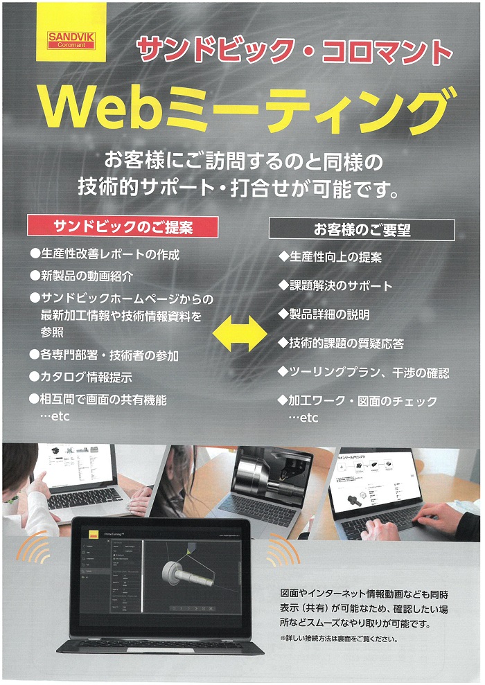 サンドビックのWEBミーティングであればお客様にご訪問するのと同様の技術的サポート・打ち合わせが可能となります。