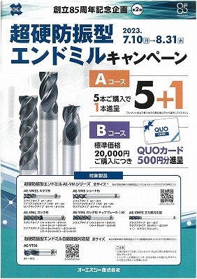 OSG 創立85周年記念企画 第2弾 超硬防振型エンドミルキャンペーンのご案内です。