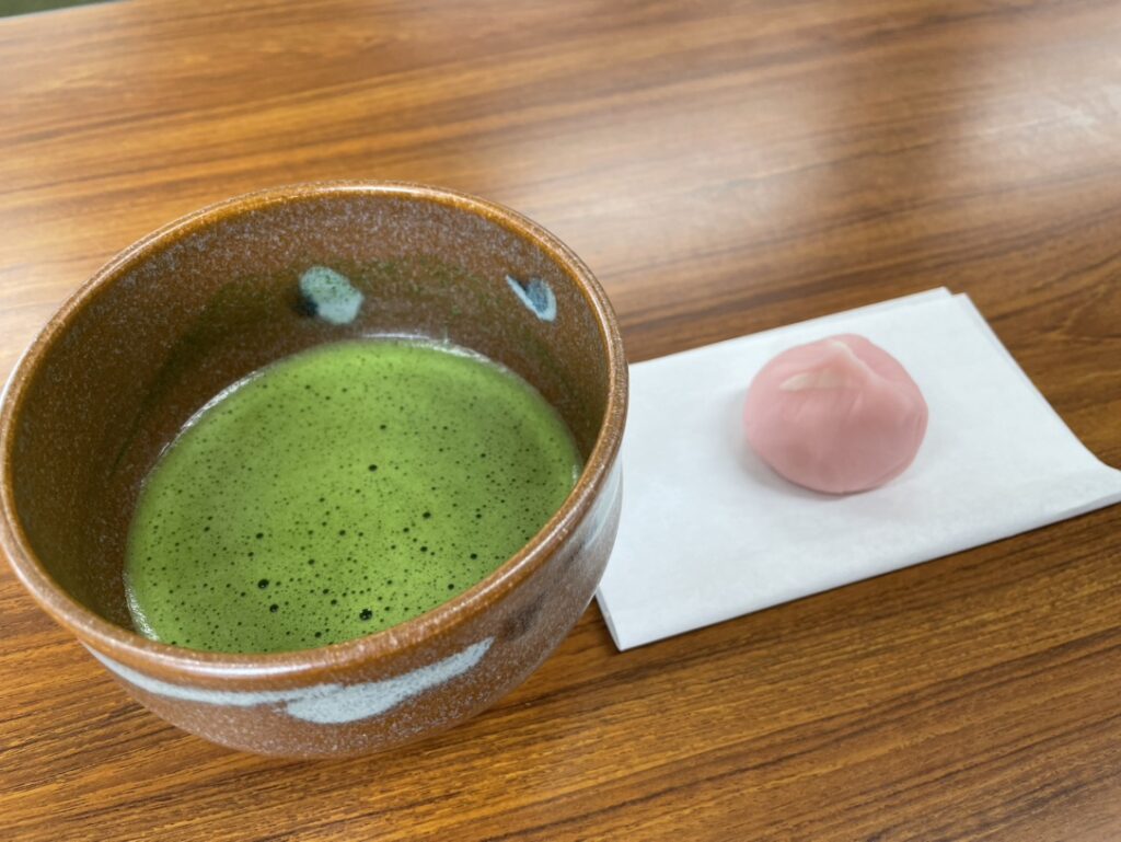 お茶菓子は『春霞(はるがすみ)』という名前の春らしいピンク色の練り菓子です。