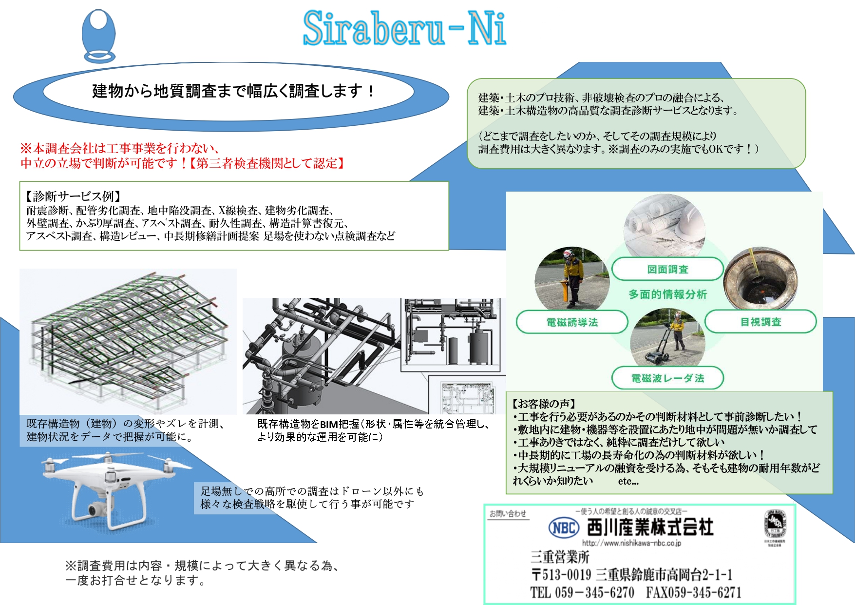こんにちは!三重営業所の内販担当の坪内です。 弊社は工場丸ごと移設・新築・撤去など大規模な工事請負の為の 建設業許可証を取得しております! 商社ではかなり珍しい為、日常品以外の対応もお任せ下さい♪ ★今回、工場の経営の為の判断材料として活用ができる内容を記載させて頂きます。 例えば ①工場の耐用年数がどれくらいなのか、改修or新築の為の今後の資金計画を練っていく、 銀行側と交渉を進めていく上で知りたい。 ②地表は何もないけども、そこに建物や設備機器を設置したい。 だけど地中に埋設物(配管やケーブルなど)の有無を把握した上で 進めていきたい ③工事ありきでの話はしたくない。あくまでも判断材料として 把握をしておきたい。工事業と調査会社が同じだと工事ありきの方向に なるのではないか? ④大規模な話になる為、工事実行が条件であれば調査も行うと 言われた。それだと経営的な判断ができない。 などなど、工場の建物に関してある程度の規模の工事を行う上で その工事は必要なのか? こういう問題が懸念されているけども、構造体を解析した時に 他に問題点があるのか調査して欲しいといった、 事もお任せください! 第三者機関として認定を受けたパートナー企業と共にヒアリングにて 訪問をさせて頂きます。![]()