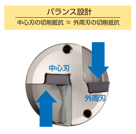 中心刃と外周刃で切削抵抗のバランスが良いインサート配置のため