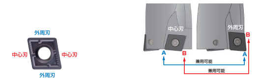中心刃と外周刃で同一のインサートが使用可能。