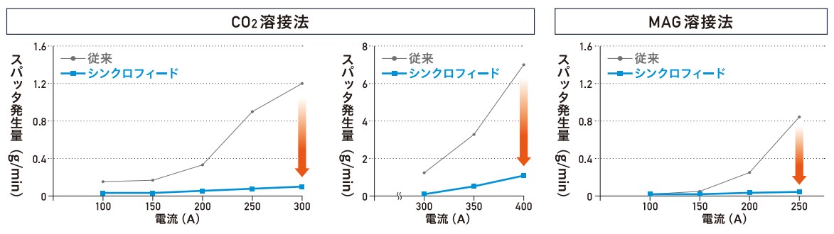 スパッタが多く出やすい400A以上でも、低スパッタを実現します。【最大99%減】