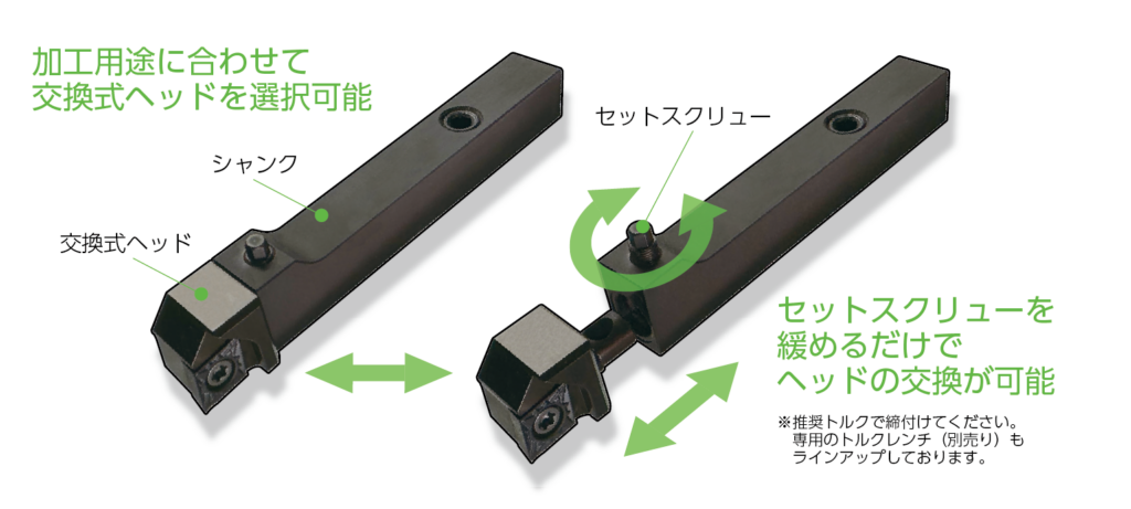 セットスクリューを緩めるだけでヘッド交換が可能