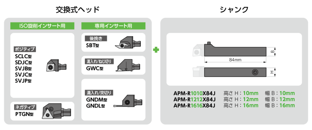 シャンクサイズ10、12、16mm角のラインアップで、CNC自動旋盤等に広く対応