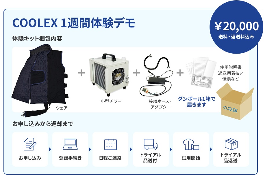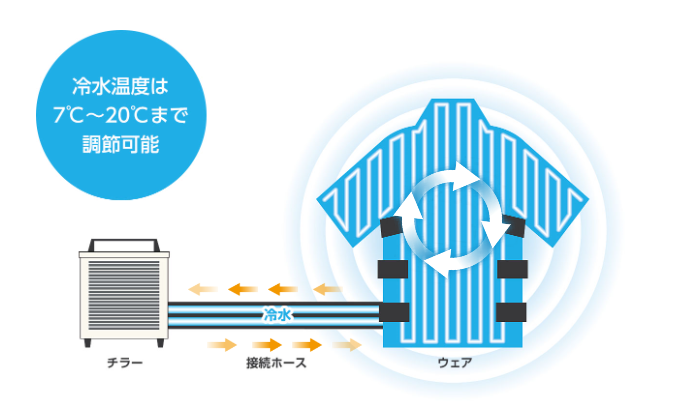 冷水をウェア内に循環させるチラー式の身体冷却システムです