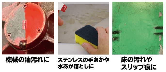 機械の油汚れはもちろん、床の汚れやスリップ痕にも効果的。
