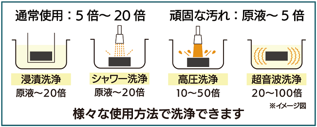 浸漬洗浄、シャワー洗浄、高圧洗浄、超音波洗浄など