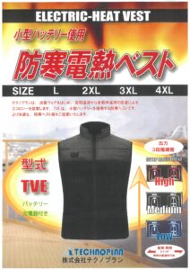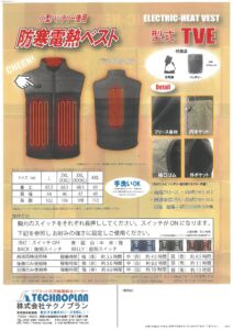 株式会社テクノプラン様から、防寒電熱ベスト 型式「TVE」のご紹介になります。