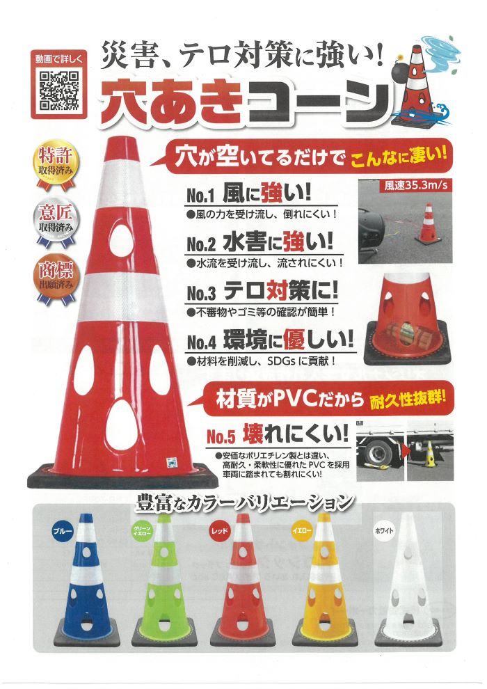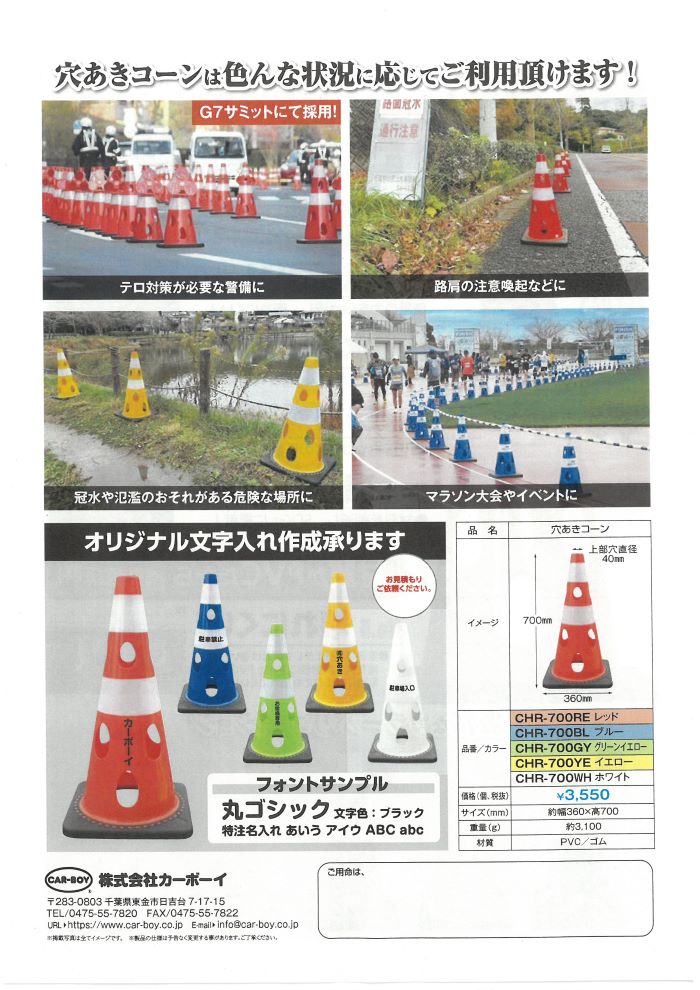 カーボーイの穴あきコーンをご案内いたします。 オリジナル文字入れ作成も承ります。 詳細は担当の営業にお気軽にお問い合わせ下さい。