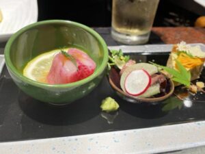 今回は前菜の盛り合わせ、サラダ、活けアワビの鉄板焼き、