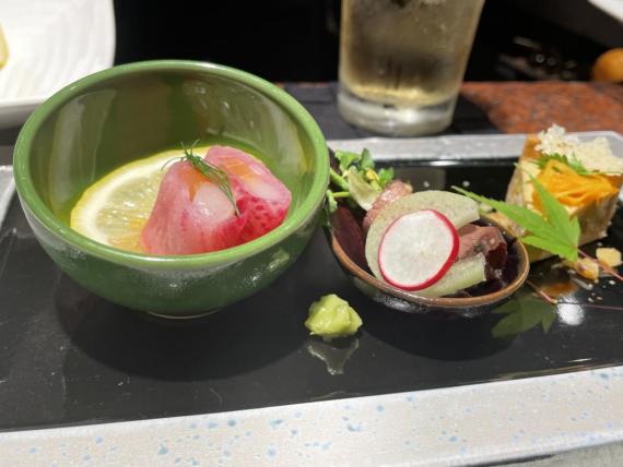 右から帆立とサーモンのインボルティーニ、和牛のあぶり、サツマイモのキッシュ