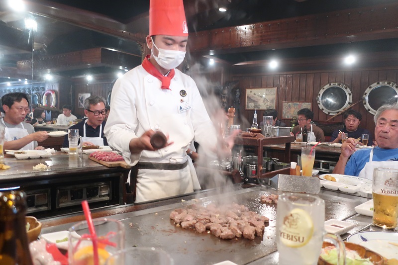 帽子の長いユニークな店員さんが目の前でステーキを焼いてくださいました!