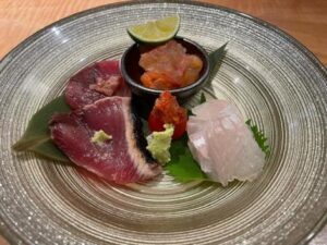↑お造り盛り(カツオ・伊勢海老・メイチダイ)